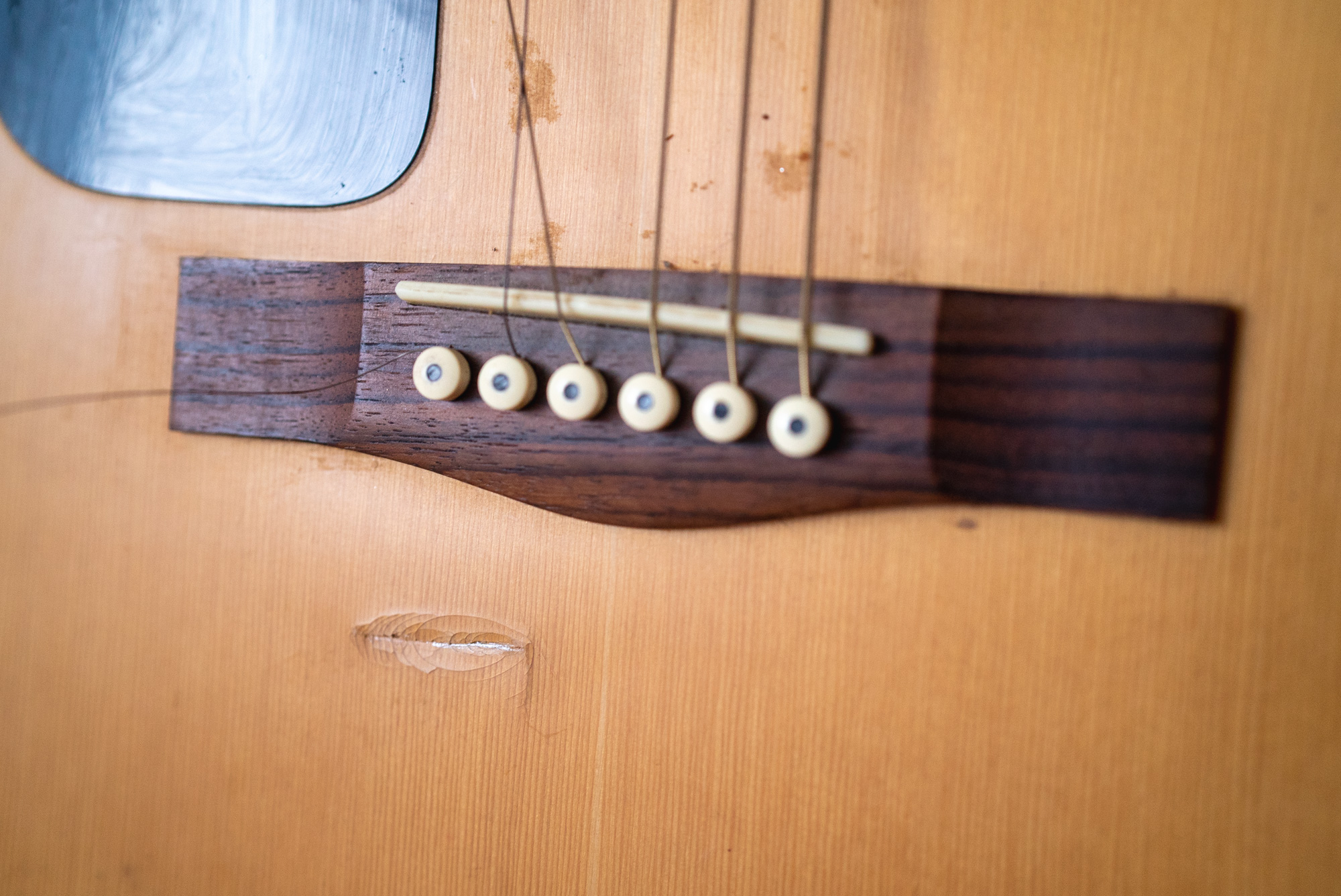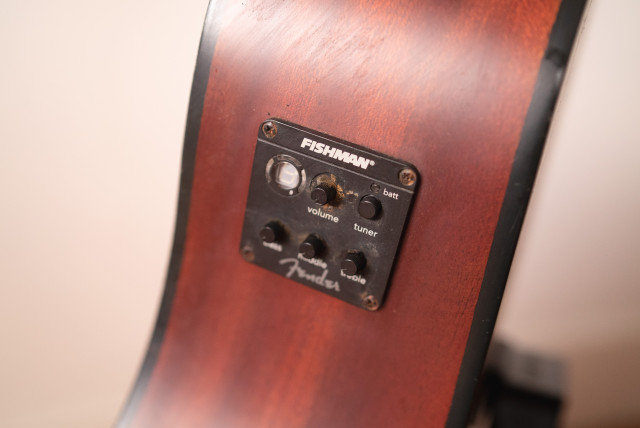 I’ve only just restrung the freebie Epiphone acoustic, and this guitar looks to be pretty similar except it’s pretty beat up. It’s got a Fishman preamp built in though! Tuner, volume, bass, mid and treble controls. I’ve not even checked to see if it works.